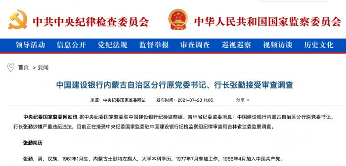 7月23日,中央纪委国家监委网站披露,据中央纪委国家监委驻中国建设银行纪检监察组、吉林省纪委监委消息:中国建设银行内蒙古自治区分行原党委书记、行长张勤涉嫌严重违纪违法,目前正在接受中央纪委国家监委驻中国建设银行纪检监察组纪律审查和吉林省监委监察调查。