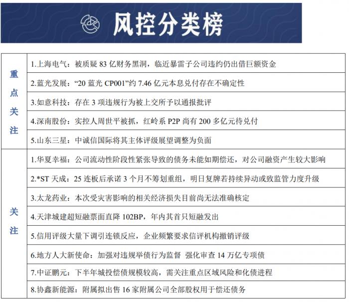 关注暴雷、违约企业后续进展。上海电气在5月末财务暴雷,7月22日,证券时报深度调查质疑其在子公司暴雷违约公告之前仍出借巨额资金,造成83亿财务黑洞。蓝光发展在中票发生实质性违约后,7月22日,公告称应...