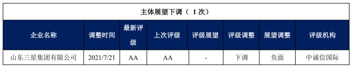 7月21日,中诚信国际发布公告称,决定维持山东三星集团有限公司的主体信用等级为AA,将主体信用等级撤出信用评级观察名单,评级展望调整为负面;维持“18三星MTN001”和“19三星MTN001”的债项信用等级为AA,将债项信用等级撤出信用评级观察名单。