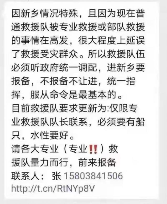 23日下午,新乡方面称,外地救援队进入新乡前要报备,须是专业救援队,带有专业设施,不报备不让进,同时,必须听从政府统一调配。