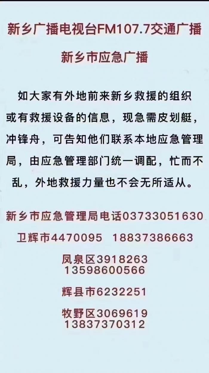 新乡牧野区政府发文称,当地急缺冲锋舟及驾驶员、救生圈、救生衣、50米水面安全绳、医疗急救包、应急式手电、沙袋、帐篷、睡袋、防潮垫、充电宝等物资。