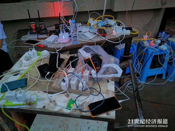 记者在现场看到,在厂区门口临时搭建的桌子上,布满了插排,员工手机正在充电。