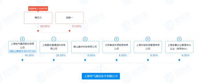 启信宝显示,上电通讯公司的第二大股东就是上海星地通,持股比例为28.5%,而隋田力通过上海星地通和上海奈攀企业管理合伙企业(有限合伙)合计持有上电通讯公司26.85%的股权。