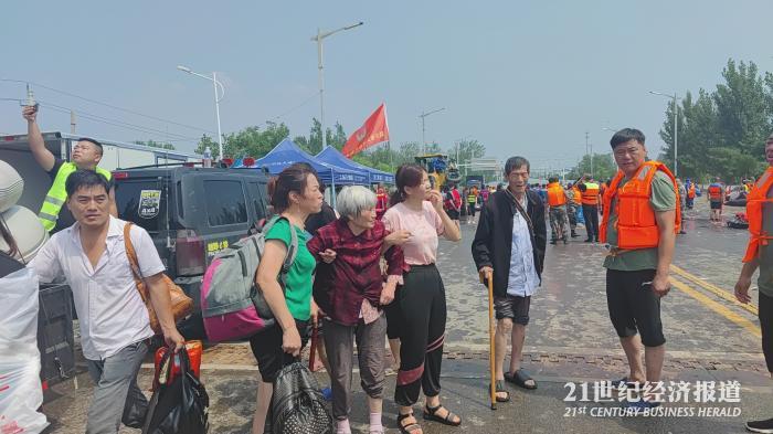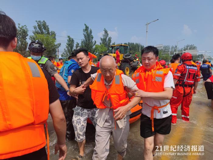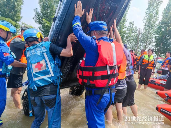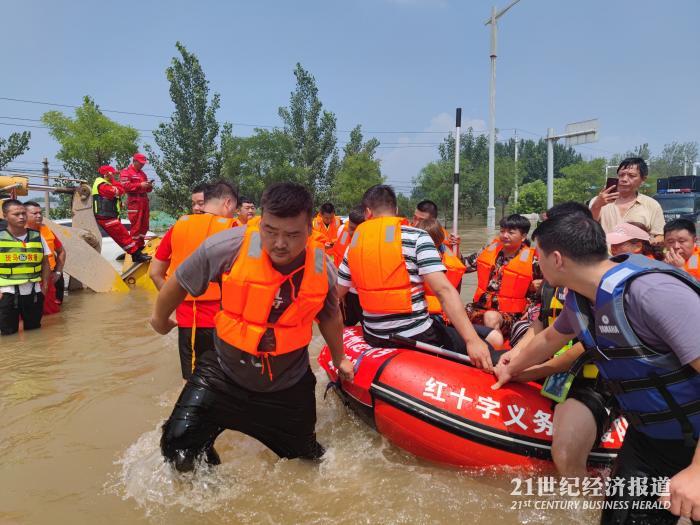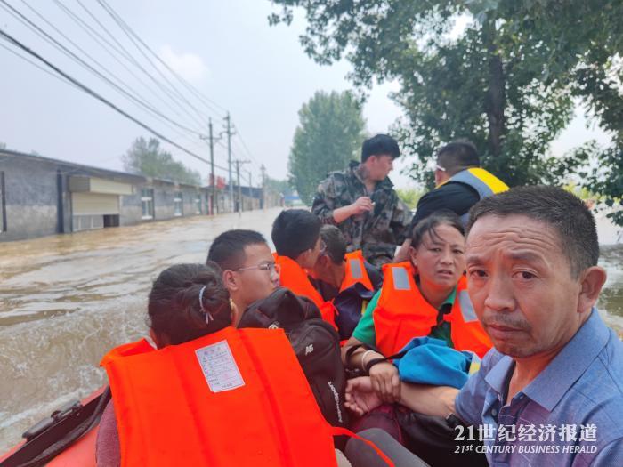 21世纪经济报道在现场观察到,周边河水湍急且已经漫过部分桥面,桥下的二层小楼只剩房顶,河面上还漂浮着数座移动板房,不断有摩托艇往返期间,寻找受困人员。