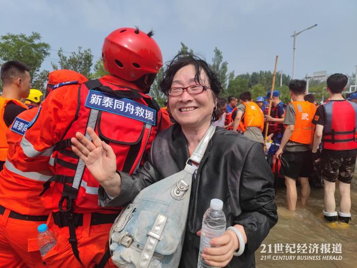 21世纪经济报道记者随后与现场救援队同乘一艘大型动力船执行紧急任务,前往一处高地搜救被困老人。在行船过程中,记者发现由于水位较高,原本处于高位的高压电线成了救援船只的拦路虎,乘船人员必须时常俯身趴行。在搭乘灾民回程时也有人因未注意到电线而险些被刮蹭落水。