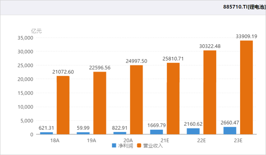 以锂电池为例,全行业上市公司净利润从2019年的59.99亿,增长到2020年的822.91亿,预计2021年的净利润是1669.79亿。