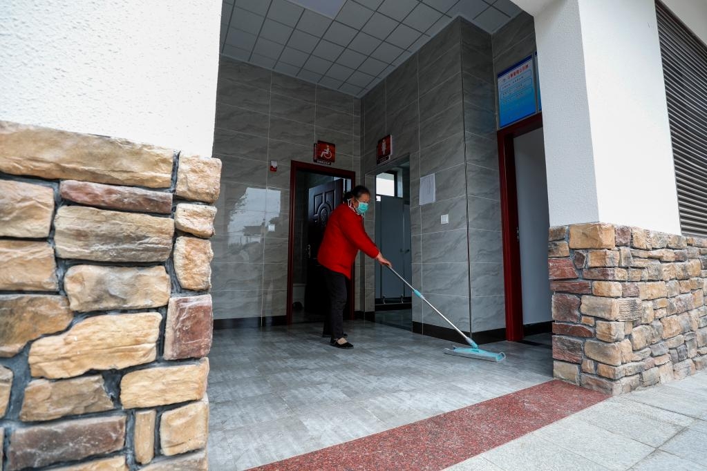 2020年4月8日,重庆市沙坪坝区中梁镇龙泉村村民吴桂慧在打扫村里的公厕。新华社发(黄伟摄)