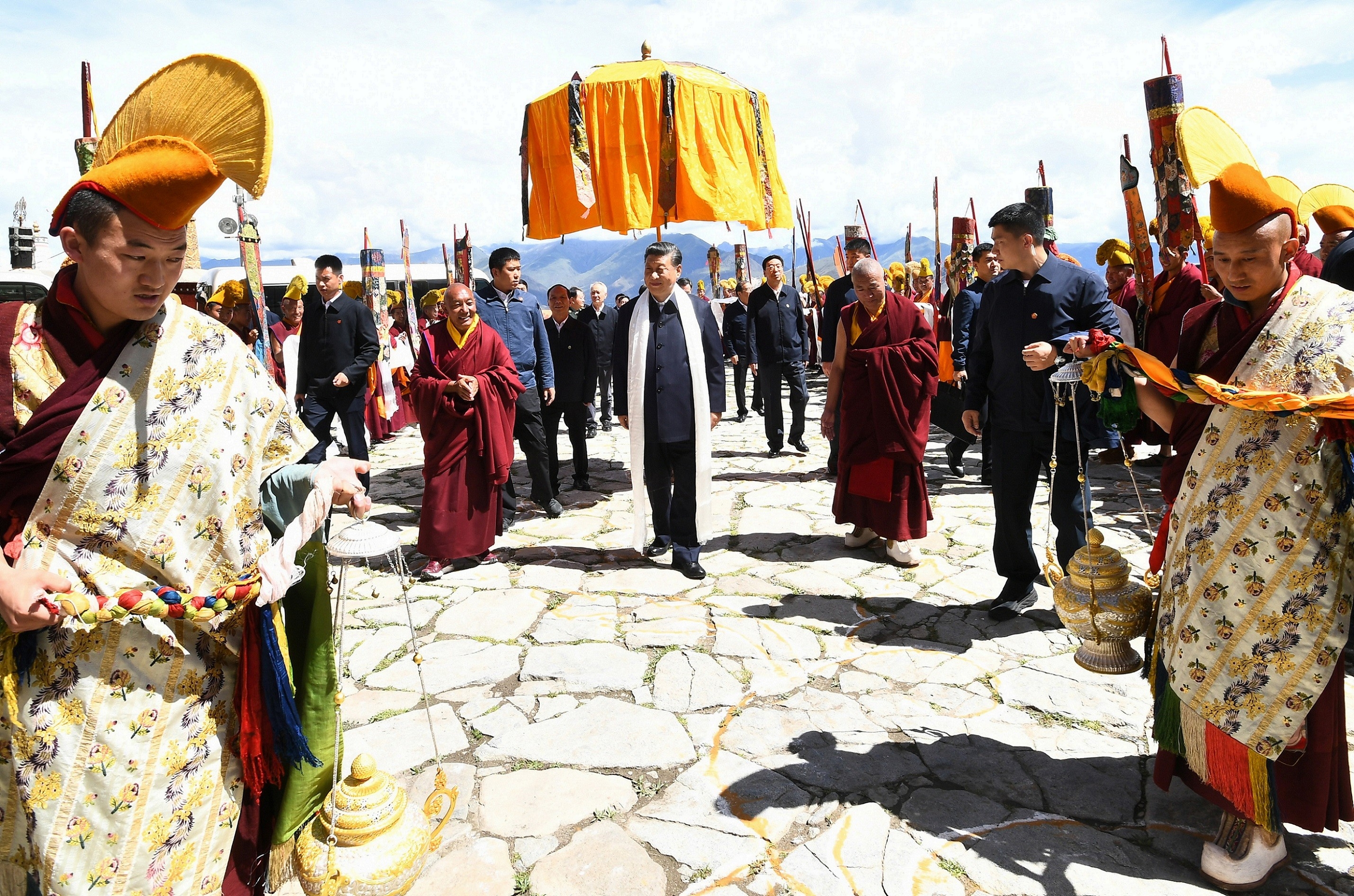 僧人提香炉、持宝伞,习近平总书记沿台阶步入措钦大殿。
