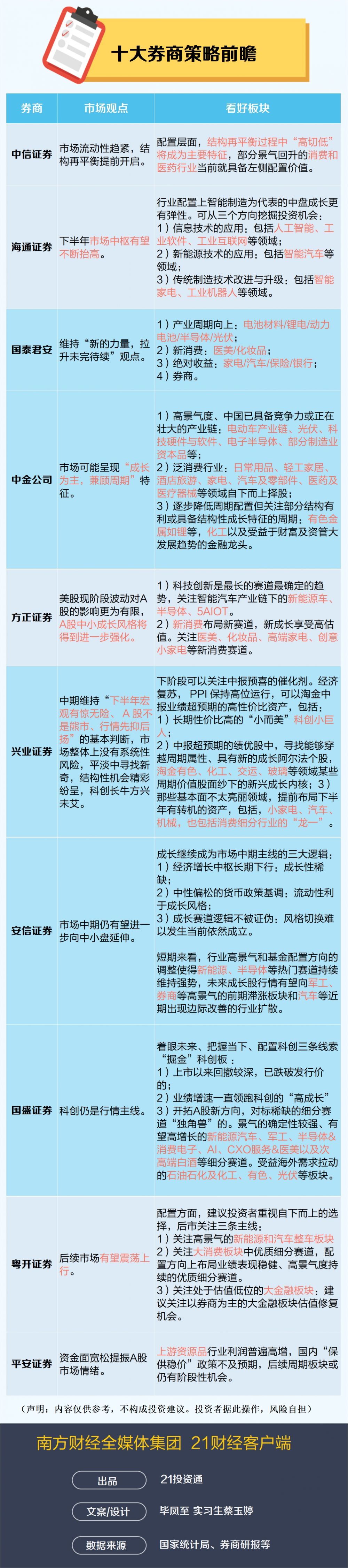 对于A股未来走势,券商纷纷发表看法。海通证券表示,下半年市场中枢有望不断抬高,保持乐观态度。中金公司表示,市场可能呈现“成长为主,兼顾周期”特征。安信证券则表示,市场中期仍有望进一步向中小盘延伸。