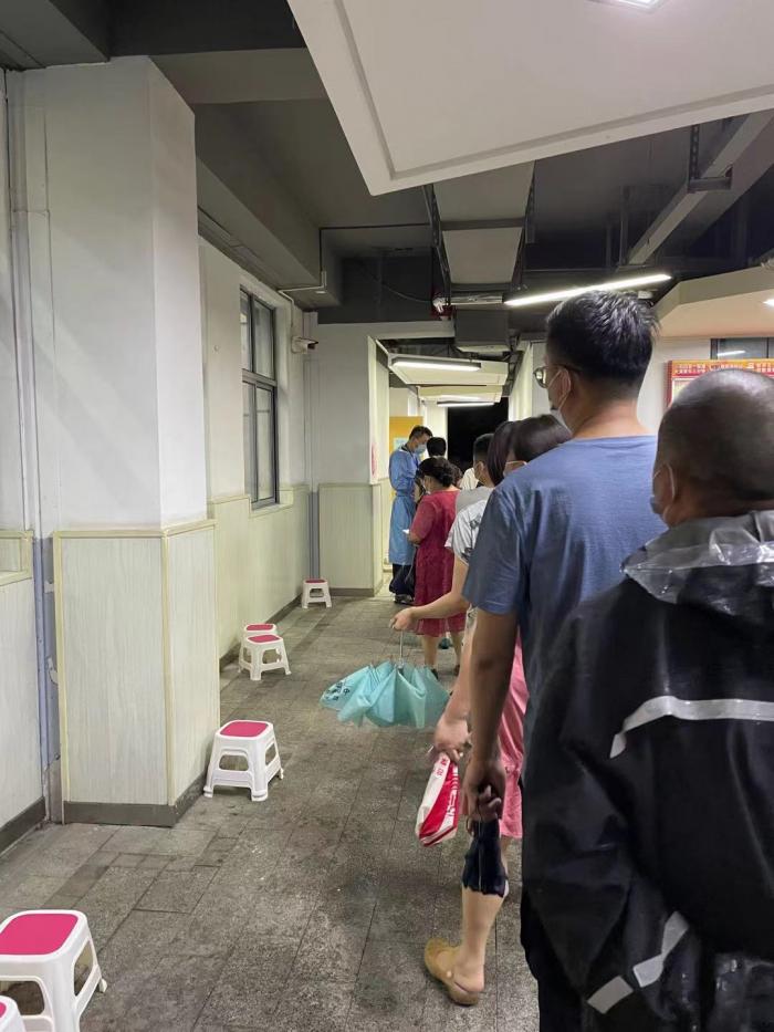 学校正门前架起了临时遮雨棚,进入后,外围人群卸下雨伞,由一队自动分为两排,每排约10人。“因为检测的时候是10人一组,我们重点提醒最前、最后的2个人,让队伍不跟丢,有序进行。”一个中年男保安对咨询的市民说。