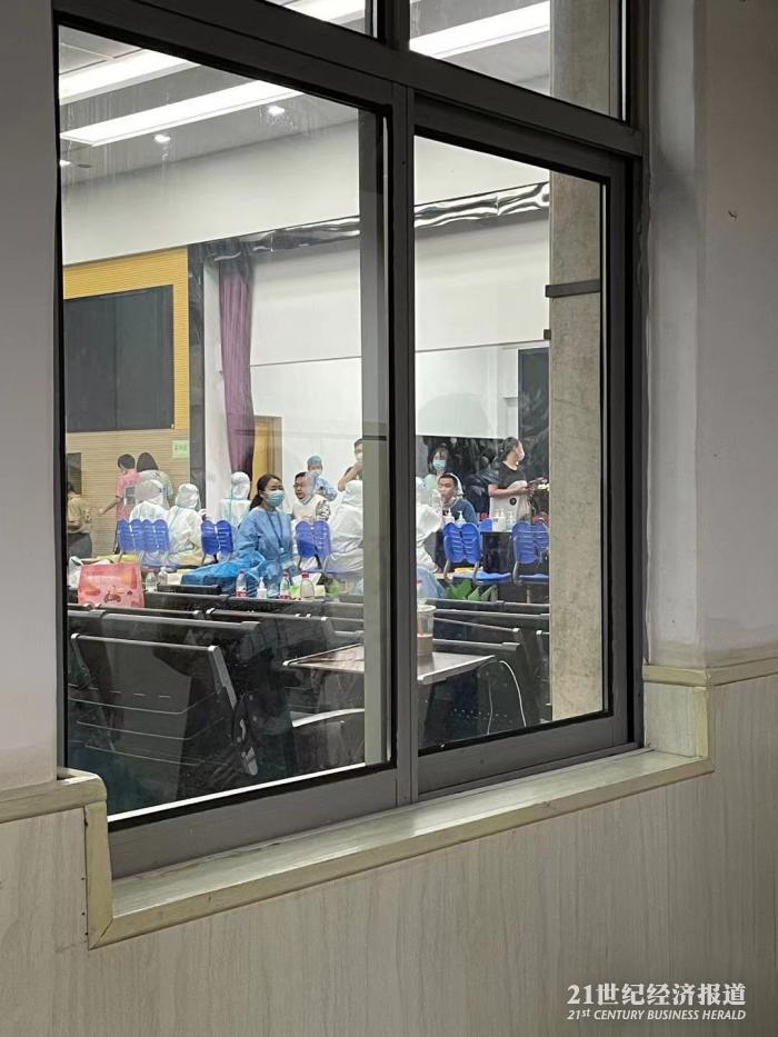 多个工作人员事无巨细,在指导和讲解注册的同时,还需要不时提醒年纪较大的市民注意脚下台阶。他们指挥着人群队伍依次进入检测范围等候区。穿着防护服的核酸检测的医护人员则在会议室的舞台上工作。