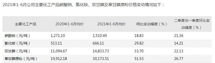 公司披露的上半年经营数据显示,2021年1-6月,双甘膦、草甘膦原粉均价分别为14833.73元/吨和30173.51元/吨,同比增长33.7%和51.53%,同时碳酸钠、氯化铵产品均价亦有不同程度上调。