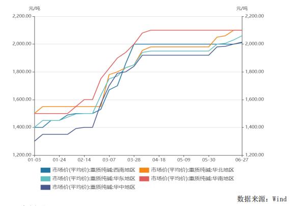 2006年至今,重质碱现货市场价在1100—2500元/吨区间波动,6月底国内2000元至2100元/吨的价格已升至历史次高位。
