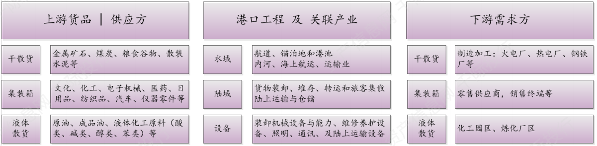 港口行业属于交通运输行业,是基础性行业,其上游行业包括水运、陆运、装备制造、工程建设等行业,上游按照运输货源的品种,主要分为集装箱、干散货和液体散货。集装箱为海上货运主要方式,与进出口贸易景气度相关度高;干散货中主要分为煤炭和金属矿石,为工业原材料,与腹地内工业行业及企业的景气度相关;液体散货主要为原油和成品油,需求的大小取决于化工、炼化企业的景气度、交通运输的消耗以及战略石油储备等。下游行业包括冶金、石化、电力、矿产、农业以及贸易等行业。从下游产业看,航运企业是港口的主要客户群。首先,港口吞吐量会受到企业码头运力、航线安排的影响,而这都会受到企业运营模式、网络布局调整的影响;其次,港口业务会受到航运企业船型变化、相关需求变化的影响;第三,航运市场属于典型周期性行业,港口业的发展无疑会受到市场供求与价格变化的影响。