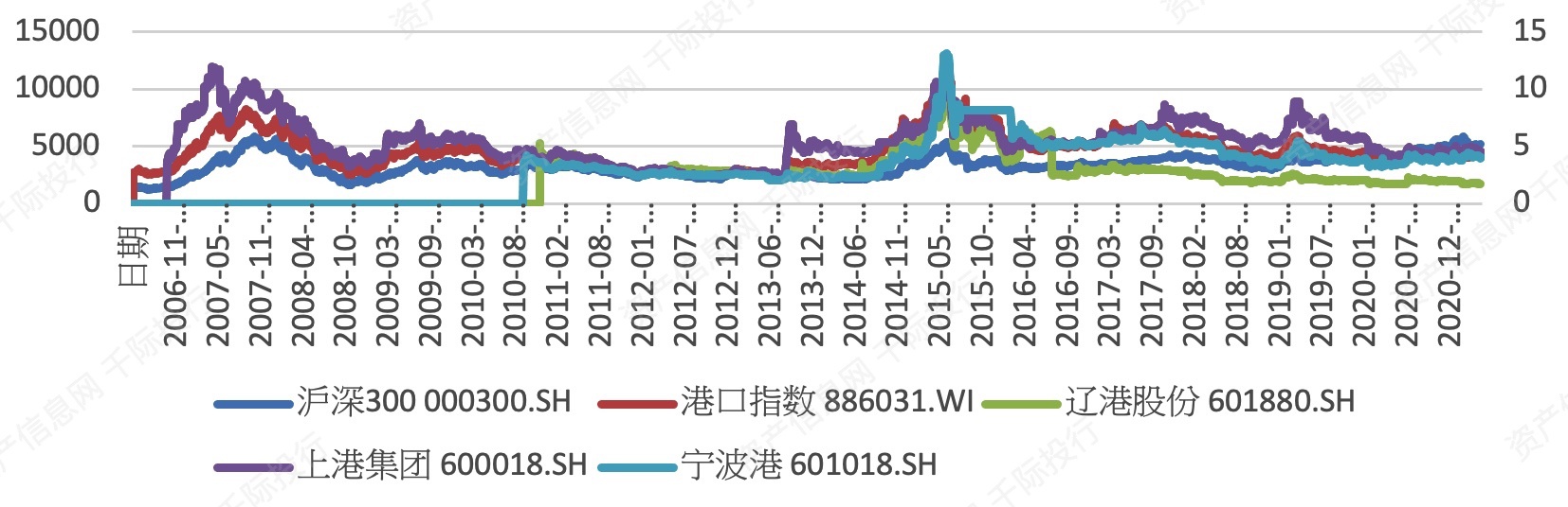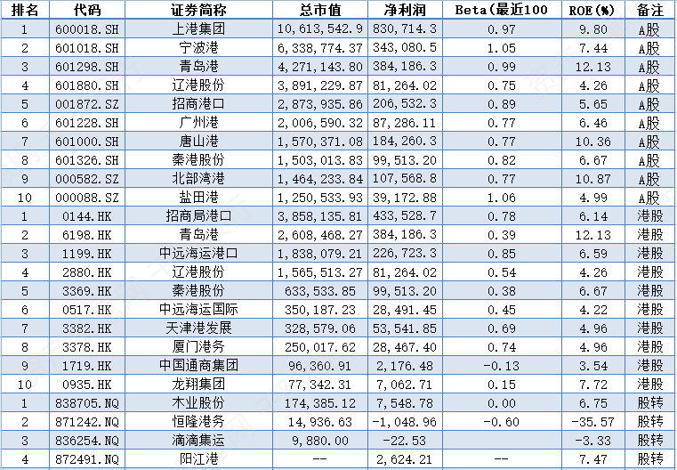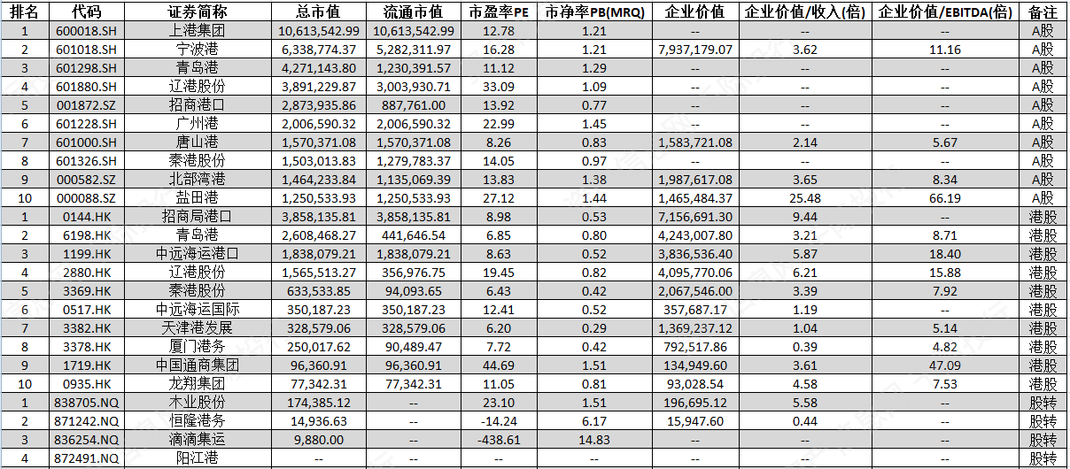 中国主要企业有上港集团[600018.SH]、宁波港[601018.SH]、青岛港[601298.SH]、辽港股份[601880.SH]、招商港口[001872.SZ]、广州港[601228.SH]、唐山港[601000.SH]、秦港股份[601326.SH]、北部湾港[000582.SZ]、盐田港[000088.SZ]、招商局港口[0144.HK]、青岛港[6198.HK]、中远海运港口[1199.HK]、辽港股份[2880.HK]、秦港股份[3369.HK]、中远海运国际[0517.HK]、天津港发展[3382.HK]、厦门港务[3378.HK]、中国通商集团[1719.HK]、龙翔集团[0935.HK]、恒隆港务[871242.NQ]、滴滴集运[836254.NQ]、阳江港[872491.NQ]等。