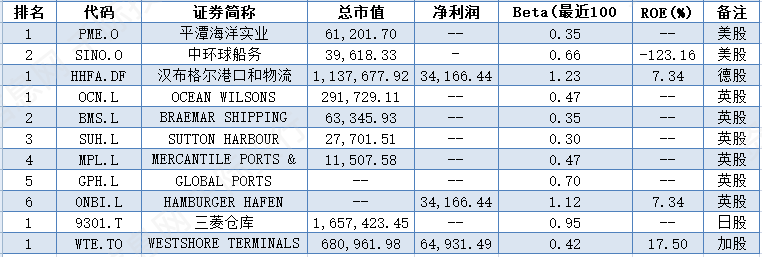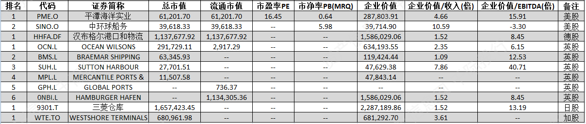 全球非中国主要企业有平潭海洋实业[PME.O]、中环球船务[SINO.O]、汉布格尔港口和物流[HHFA.DF]、OCEAN WILSONS[OCN.L]、MERCANTILE PORTS & LOGISTICS[MPL.L]、GLOBAL PORTS[GPH.L]、HAMBURGER HAFEN[0NBI.L]、三菱仓库[9301.T]、WESTSHORE TERMINALS INVESTME[WTE.TO]等。