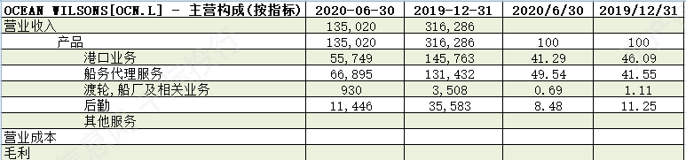 (2) OCEAN WILSONS[OCN.L] 海洋威尔逊控股有限公司是一家投资控股公司。该公司通过其子公司在巴西从事海洋和物流服务。它的分部包括海运服务和投资。海事服务部门在巴西提供拖船,港口码头,船舶代理,离岸,物流和造船服务。投资部门持有国际投资组合。它的子公司是威尔逊儿子有限公司,海洋威尔逊(投资)有限公司,威尔逊儿子行政管理有限公司,VIS有限公司和伊迪·桑托·安德烈·德尔加尔·卡尔加有限公司。Wilson Sons Limited的活动包括港口和海洋拖曳,集装箱码头运营,海上油气支持服务,建筑,物流和船舶代理。海洋威尔逊(投资)有限公司是一家投资公司,拥有国际投资组合。EADI SANTO ANDRE TERMINAL DE CARGA LTDA从事保税仓库业务。