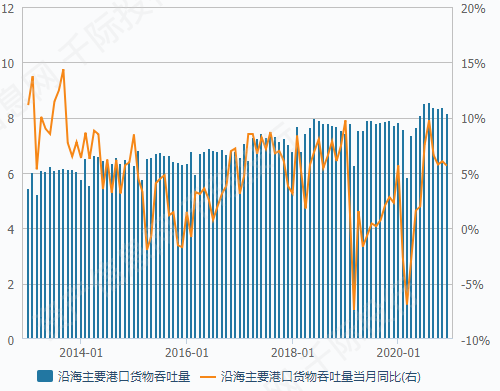 (5) 中国煤炭销量恢复至高位,重点电厂存在补库需求;钢铁行业景气带来铁矿石进口数量增长,港口、钢厂存在补库需求;在基建投资加码的情况下,煤炭、铁矿石等大宗商品短期需求量有望维持高位,对未来港口吞吐量提供一定支撑。