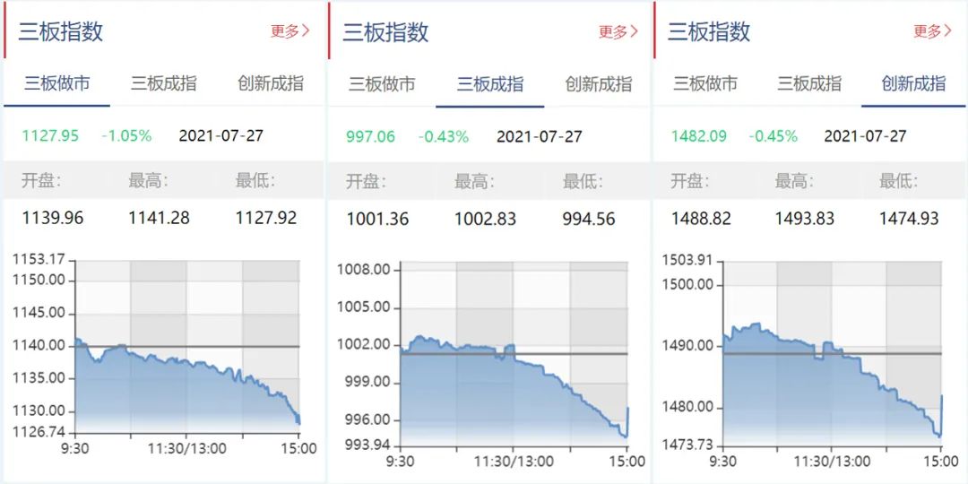 截至7月27日收盘,三板做市报1127.95点,下跌1.05%;三板成指报997.06点,下跌0.43%;三板创新报1482.09点,下跌0.45%。