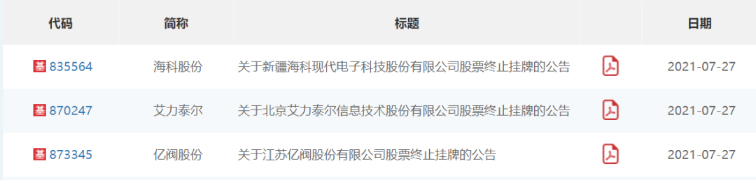 7月27日,新三板基础层公司海科股份(835564)、艾力泰尔(870247)、亿阀股份(873345)终止挂牌。
