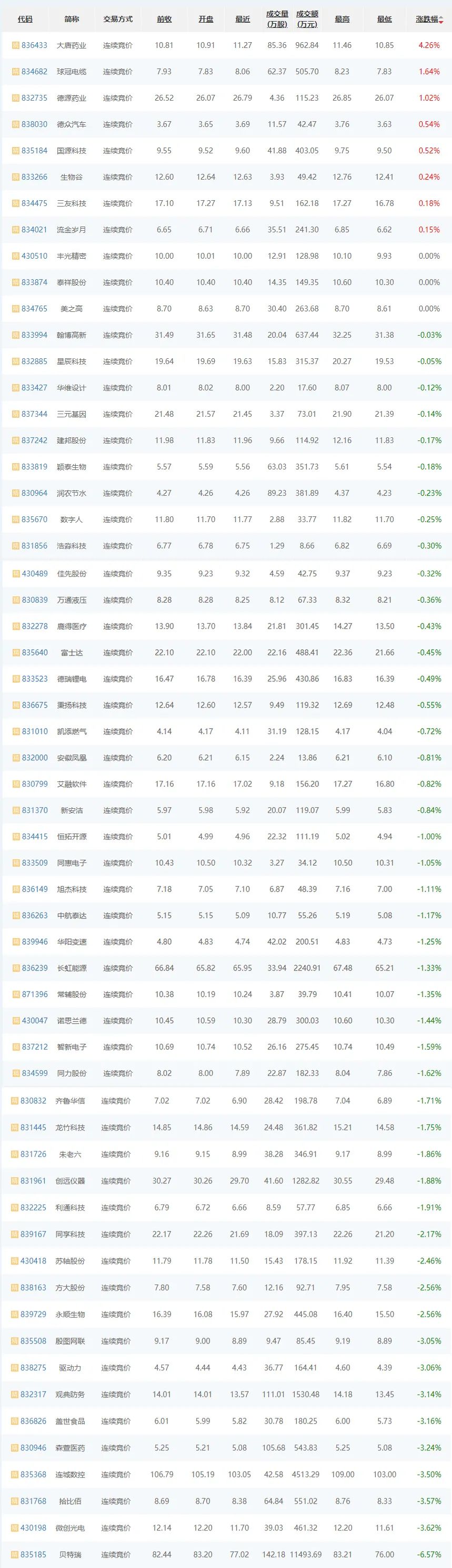 7月27日,精选层涨跌互现,8家企业上涨,3家平盘,47家下跌。其中,大唐药业(836433)连续两日涨幅居首,上涨4.26%;其次,球冠电缆(834682)上涨1.64%;贝特瑞(835185)跌幅居首,下跌6.57%;微创光电(430198)居次下跌3.62%;丰光精密(430510)、泰祥股份(833874)等平盘。