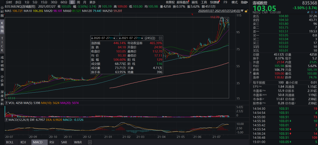 公开数据显示,截至7月27日,首批挂牌精选层的公司中,连城数控一年涨幅为446.14%,位居第一;同享科技涨幅为284.63%,位居第二;富士达、鹿得医疗上涨一倍多,涨幅分别为178.39%、169.68%。