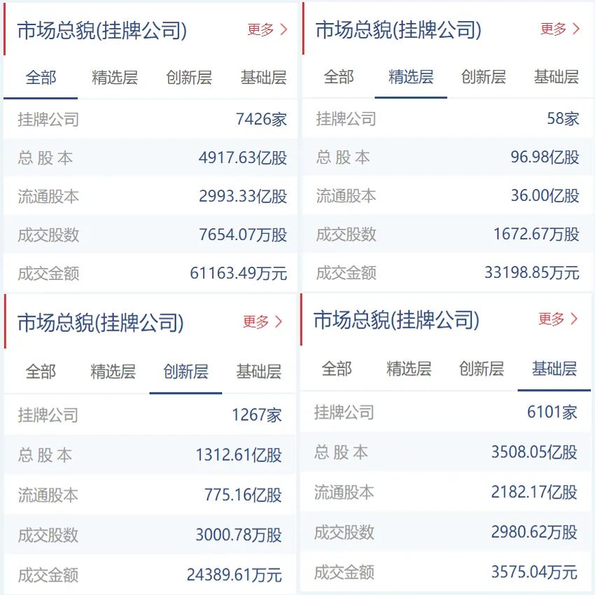 新三板挂牌公司总计7426家(精选层58家,创新层1267家,基础层6101家),总股本4917.63亿股,流通股本2993.33亿股。