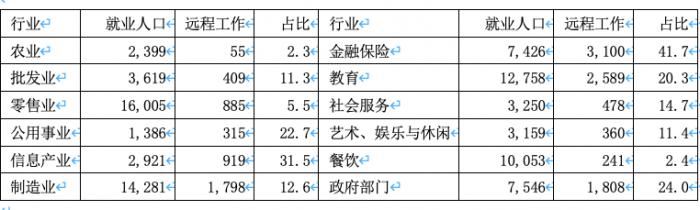 表1 美国能提供远程或居家办公机会的行业分布一览表 单位(千人 %)