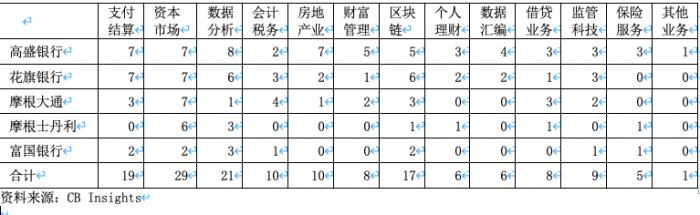 在金融与保险行业中,商业银行尤其注重用科技手段解决业务瓶颈问题。在美国,商业银行可从事商业银行、投资银行、信托业务和保险业务等多种业务(混业经营),具有着更大的动力投资金融科技,所以,金融科技项目最多的金融巨头是高盛、花旗和摩根大通。自2018年以来,高盛和花旗分别通过高盛战略投资和花旗风险企业参与了21个和11个金融科技交易,前者主要侧重于房地产、数据分析和支付与结算,而后者自2017年以来资助了4个区块链、3个资本市场和3个支付结算创投公司,以建立开放银行基础架构。摩根大通专注于资本市场解决方案和升级支付体系业务,支持了4个资本市场和4个会计(应收与应付账款)创投公司。2012年以来,摩根士丹利、富国、美国银行和PNC金融集团至少投资了5个金融科技创投公司。这些金融机构的项目重点是资本市场、数据分析、支付业务、区块链、会计与税务和房地产,与全球金融科技的发展趋势基本相一致。