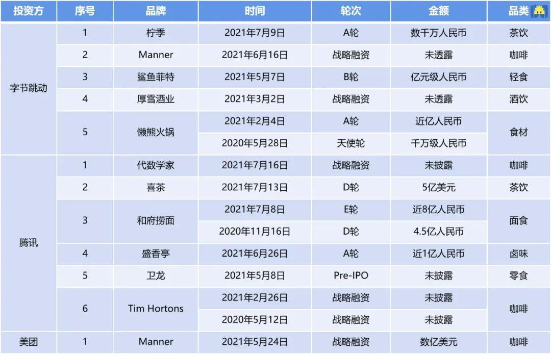 7月,字节跳动冷不丁投了一家“网红”柠檬茶,腾讯就高调参投“顶流”喜茶;腾讯在今年2月和5月两度投资一家连锁咖啡,美团和字节跳动就分别在5月和6月对标押注咖啡界新宠Manner,腾讯见状再在7月投下一家精品咖啡。