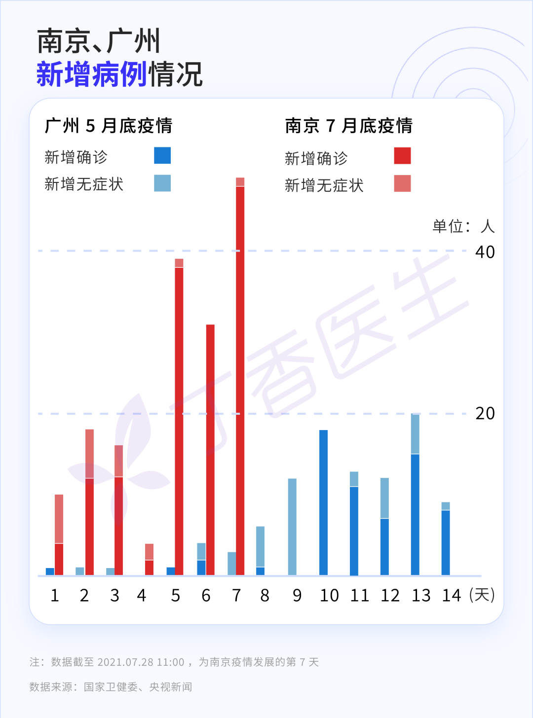 从目前获得的信息来看,南京此次疫情更加凶险,感染人数更多,波及省市更广。同样是人口密度高的大城市,同样都是 Delta 变异体,两地疫苗接种率没有详细数据,但是合理推测南京目前的疫情接种率应该比两个月前的广州更高一些。