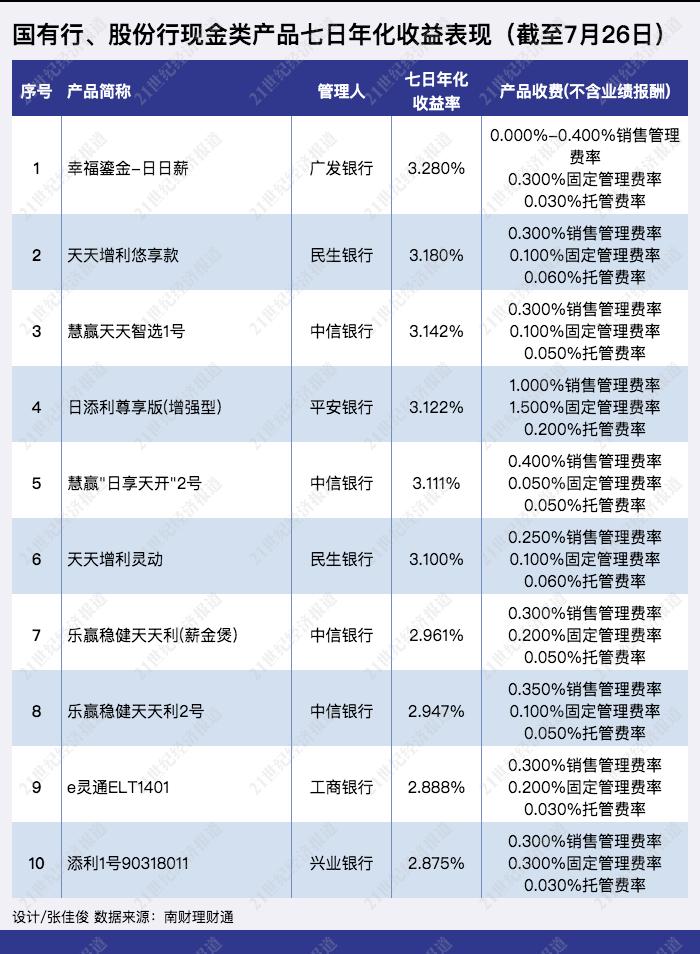 截至7月26日,从国有行、股份行现金管理类产品七日年化收益率来看,股份行现金类表现较为抢眼,国有行中仅工商银行有产品上榜。股份行中,民生银行、中信银行等均有多只现金类产品在榜。