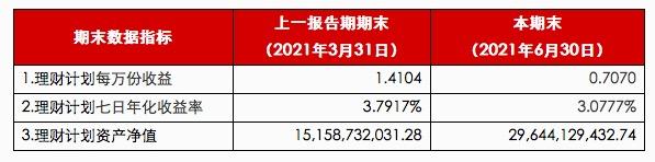 据该产品2021年二季报显示,截至二季度末,产品份额总额296.44亿份。与一季度末151.59亿份相比,份额规模几近翻倍。不过,在产品收益上,二季度末较之一季度末七日年化出现明显下滑,万份收益也“腰斩”。