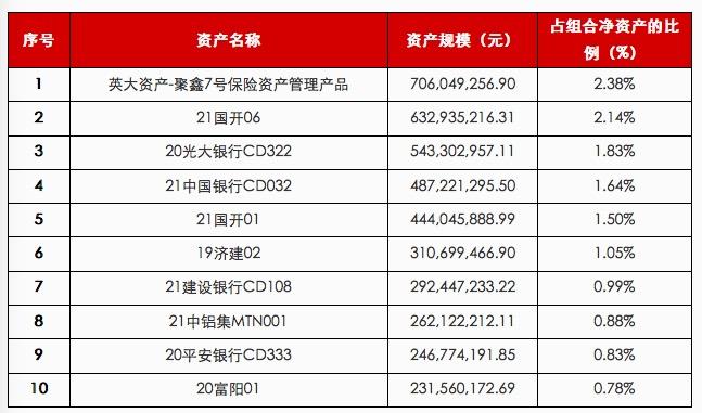 从前十大持仓来看,第一季度、第二季度该产品第一大持仓均为“英大资产-聚鑫7号保险资产管理产品”。“该资管计划由英大保险资产管理有限公司发行,自2020年12月22日起募集发行,于2020年12月29日正式成立。