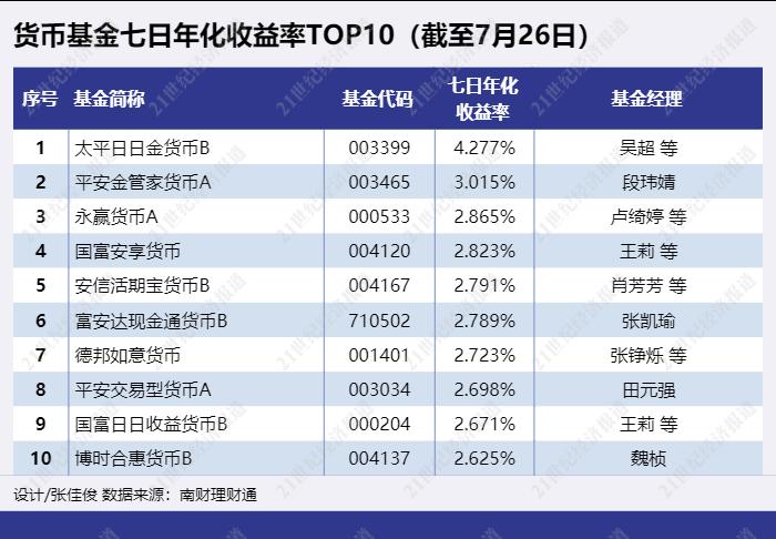 截至7月26日,从货币基金七日年化收益率TOP10来看,“太平日日金货币B”收益一骑绝尘,达4.277%。排名第二的“平安金管家货币A”七日年化3.015%,从第三名起收益率则低于3%。