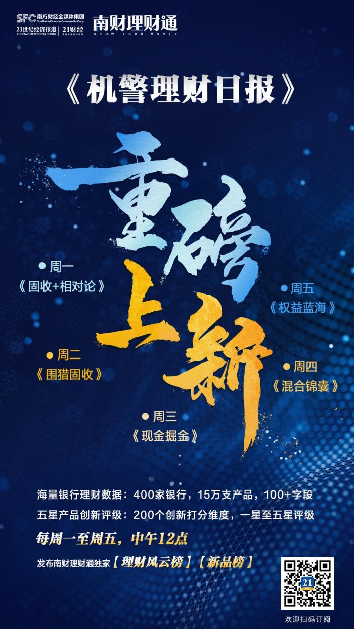 《机警理财日报》是南财理财通、21世纪经济报道旗下投资理财专栏,旨在帮投资者守好“钱袋子”。日报根据产品的投资性质对产品数据进行人工整理,每日内容各有侧重,周一聚焦固收+产品、周二纯固收产品、周三现金管理类产品、周四混合类产品、周五权益类产品,每周一至周五每日更新,尽在21财经APP,敬请关注!