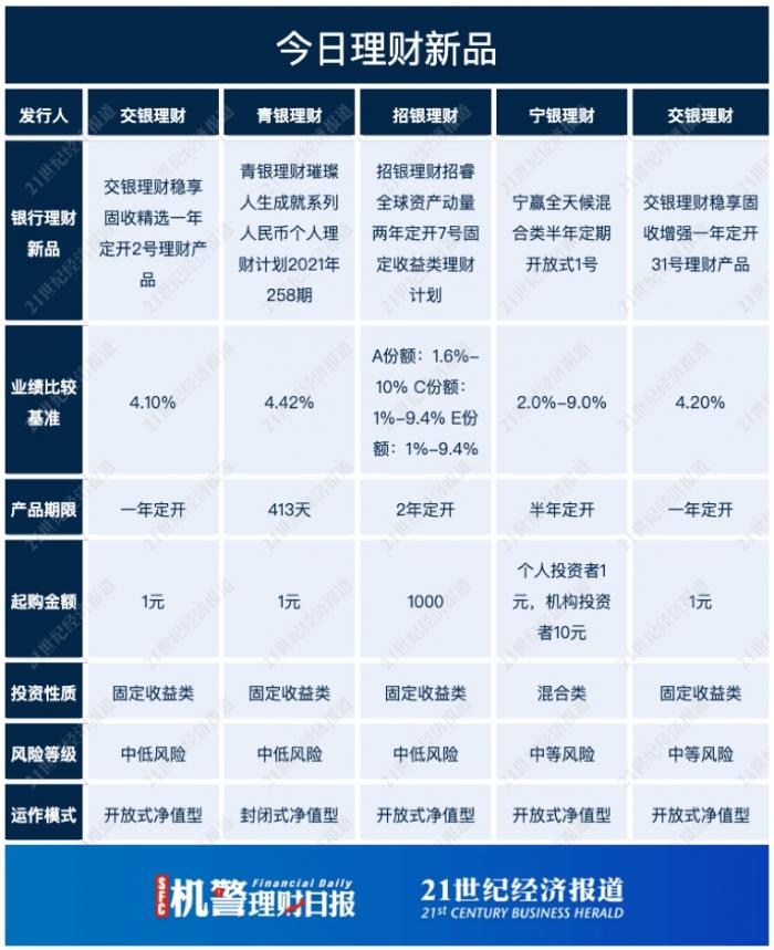 据南财理财通数据显示,多家理财公司近期发售的新品中,青银理财推出的“璀璨人生成就系列人民币个人理财计划2021年258期”产品业绩比较基准为4.42%,该产品针对经青银理财评估为稳健型及以上级别的个人投资者,认购起点为1元,封闭期为413天,中低风险等级,募集期从7月27日至8月2日。