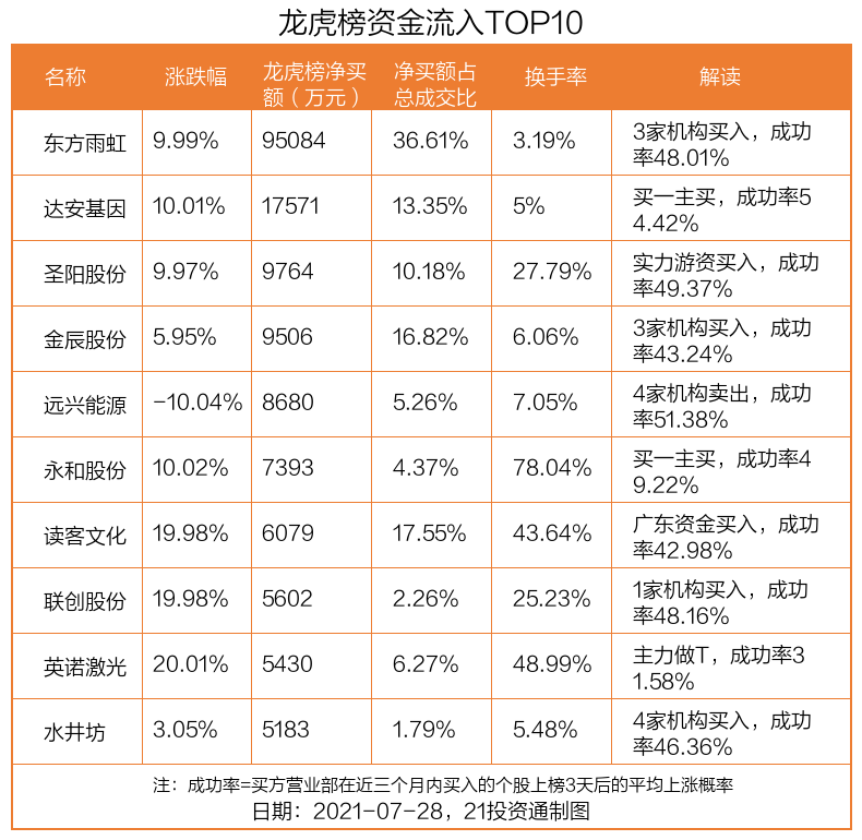 7月28日,上证指数下跌0.58%,深证成指下跌0.05%,创业板指上涨1.61%。盘后龙虎榜数据显示,共有41只个股因当日异动登上龙虎榜,资金净流入最多的是东方雨虹(002271.SZ),达9.51亿元。