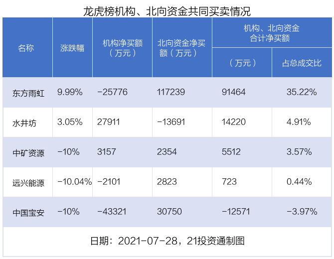值得注意的是,机构和北向资金共同净买入了中矿资源等1股;在东方雨虹,中国宝安,远兴能源,水井坊上出现分歧,机构净卖出东方雨虹2.58亿元,北向资金净买入11.72亿元;机构净卖出中国宝安4.33亿元,北向资金净买入3.08亿元;机构净卖出远兴能源2100.51万元,北向资金净买入2823.44万元;机构净买入水井坊2.79亿元,北向资金净卖出1.37亿元。