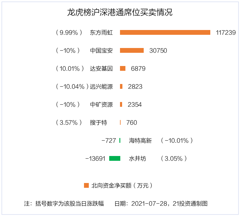 7月28日,北向资金参与龙虎榜中的个股共有8只,合计净买入14.64亿元。其中沪股通净卖出1 股,合计净卖出1.37亿元;深股通净买入6 股,净卖出1 股,合计净买入16.01亿元。