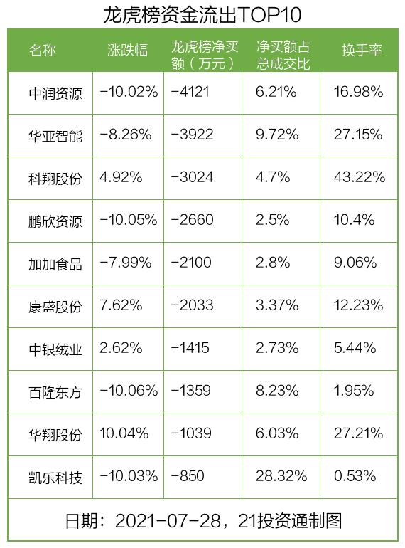 而龙虎榜中资金净流出最多的是中润资源(000506.SZ),被净卖出为0.41亿元,占总成交金额的6.21%。中润资源收盘下跌10.02%,换手率为16.98%。