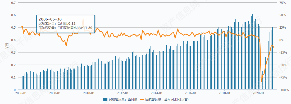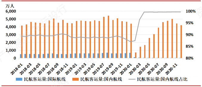2020年2月,中国民航客运量从1月的5061万人次降至834万人次,其中,国内航线约729万人次,国际航线约105万人次。从2020年3月开始,国内航线客运量逐渐回升,但时值国外疫情爆发,国际航线客运量进一步下降。截至2020年12月,国内航线客运量约4216万人次,恢复到2019年12月90.8%的水平,复苏情况较好,国际航线客运量为16.3万人次,仅恢复到2019年12月2.6%的水平,国际出行维持低迷。