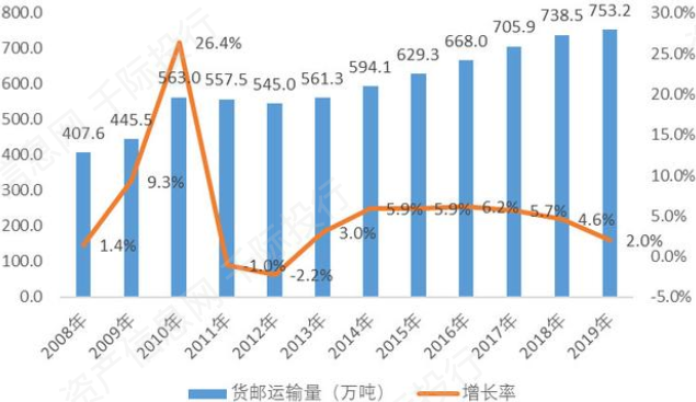 在全球经济稳步复苏和国内经济运行稳中向好的背景下,我国航空物流行业整体保持平稳较快增长。2008 年以来,我国民航货邮运输量保持整体增长,从 2008 年的 407.6 万吨增长至 2019 年的 753.2万吨。其中,国内货邮运输量511.2万吨,占总量的68%;国际货邮运输量242万吨,占总量的32%。