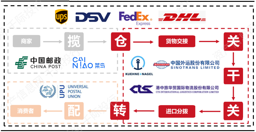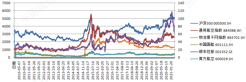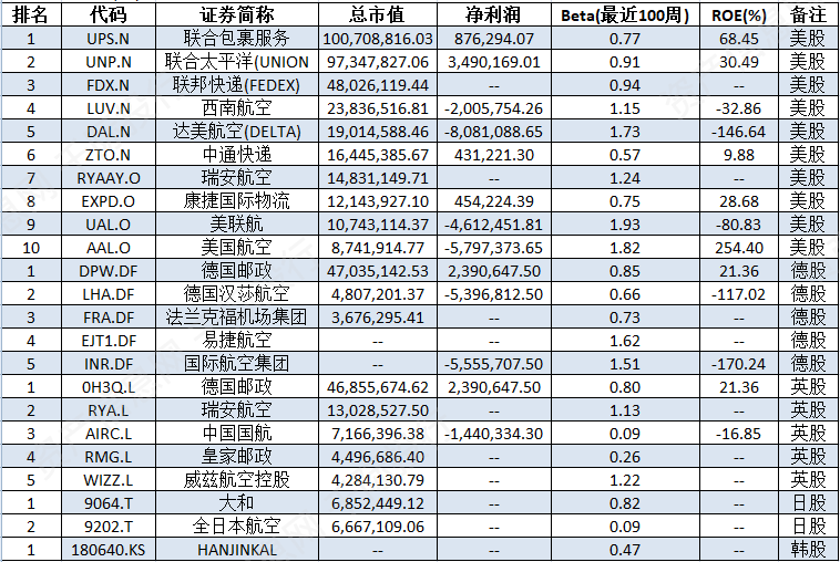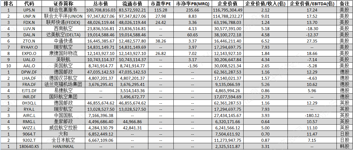 全球非中国主要企业有联合包裹服务[UPS.N]、联合太平洋(UNION PACIFIC)[UNP.N]、联邦快递(FEDEX)[FDX.N]、中通快递[ZTO.N]、瑞安航空[RYAAY.O]、康捷国际物流[EXPD.O]、美联航[UAL.O]、美国航空[AAL.O]、德国邮政[DPW.DF]、德国汉莎航空[LHA.DF]、法兰克福机场集团[FRA.DF]、易捷航空[EJT1.DF]、国际航空集团[INR.DF]、德国邮政[0H3Q.L]、瑞安航空[RYA.L]、中国国航[AIRC.L]、皇家邮政[RMG.L]、威兹航空控股[WIZZ.L]、大和[9064.T]、全日本航空[9202.T]、HANJINKAL[180640.KS]等。