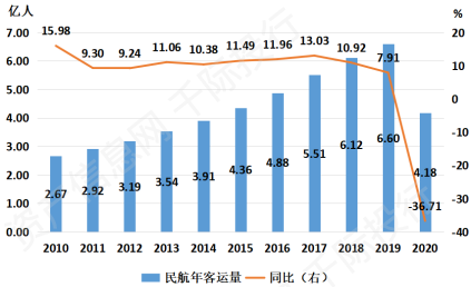 过去一年在疫情的阴霾下航空出行受到严重制约,客运量从2019年的6.24亿人次下降至2020年的4.18亿人次,同比下降36.71%。根据民航局数据,2020年第四季度,中国民航运输总周转量、旅客运输量、货邮运输量分别恢复至上年同期的76.3%、84.2%、95.8%,其中国内航线运输恢复至94.5%。2020全年完成运输总周转量、旅客运输量、货邮运输量798.5亿吨公里、4.18亿人、676.6万吨,相当于2019年的61.7%、63.3%、89.8%。2021年2月民航客运量迎来疫情以来首个月度正增长,同比大幅增长187%。