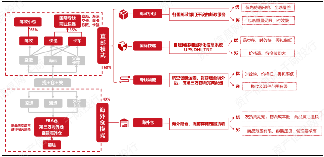 根据业务模式的不同,跨境电商可分为“直邮模式”与“海外仓 模式”。“直邮模式”指消费者通过跨境电商平台直接购买境外商品,电商平台向海关提供订单、支付、物流信息,然后商品通过物流企业运输至目标国家,进行申报入境后直接配送至消费者。“海外仓模式”指跨境电商企业通过集中采购并将商品批量报关,统一运至海外保税仓进行储存,当消费者在跨境电商平台购买商品后,跨境电商企业向海关进行报关报税,再由物流企业从仓库配送至消费者。