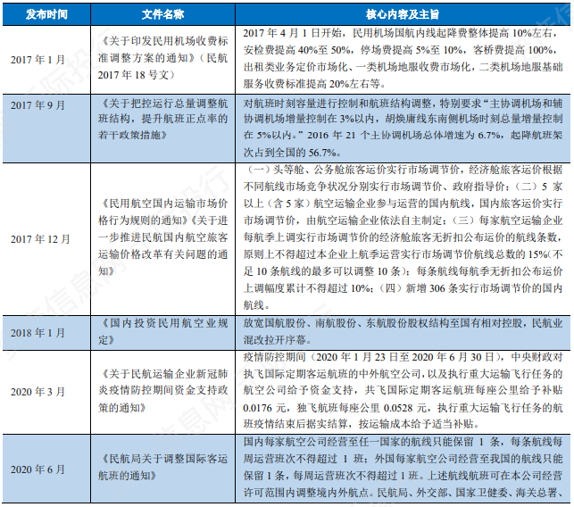 行业主管部门包括国家财政局、民航局。近年来随着国民经济发展速度有所放缓,行业自身发展需求与较严的行业管制政策之间的矛盾日益凸显。在经济发展放缓大环境下,为持续推动行业发展,近年来行业政策频发,涉及行业供给、需求、票价、税费以及股权混改等各方面,整体围绕放松管制、推进市场化改革方向。