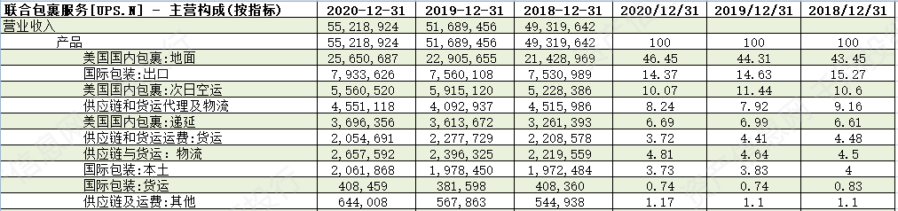 (1) 联合包裹服务[UPS.N]是世界上最大的快递承运商与包裹递送公司,同时也是专业的运输、物流、资本与电子商务服务的领导性的提供者。主要业务包括:国际快递承运、国际货运(空运、海运)、仓储服务和物流咨询等。