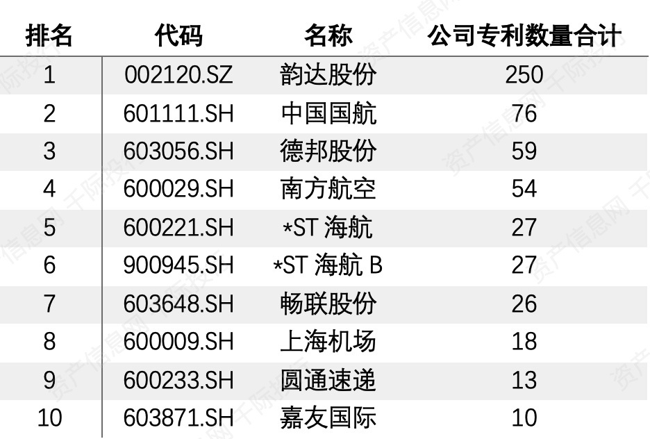 对国内航空与物流行业的各个专利申请人的专利数量进行统计,排名前十的航空与物流公司依次为:韵达股份、中国国航、德邦股份、南方航空、*ST海航、*ST海航B、畅联股份、上海机场、圆通速递、嘉友国际、顺丰控股等。