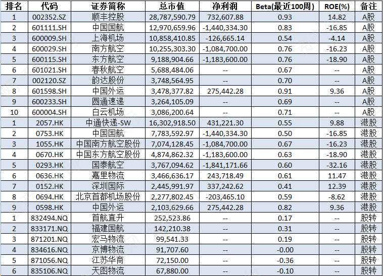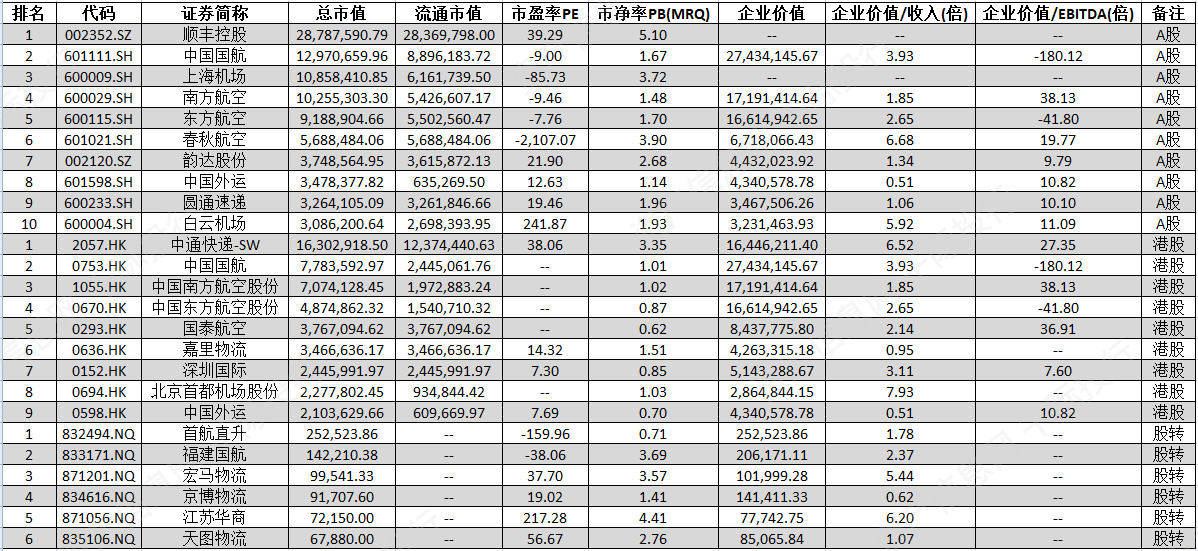 中国主要企业有顺丰控股[002352.SZ]、中国国航[601111.SH]、上海机场[600009.SH]、南方航空[600029.SH]、东方航空[600115.SH]、春秋航空[601021.SH]、韵达股份[002120.SZ]、中国外运[601598.SH]、圆通速递[600233.SH]、白云机场[600004.SH]、中通快递-SW[2057.HK]、中国国航[0753.HK]、中国南方航空股份[1055.HK]、中国东方航空股份[0670.HK]、国泰航空[0293.HK]、嘉里物流[0636.HK]、深圳国际[0152.HK]、北京首都机场股份[0694.HK]、中国外运[0598.HK]、首航直升[832494.NQ]、京博物流[834616.NQ]、江苏华商[871056.NQ]、天图物流[835106.NQ]等。